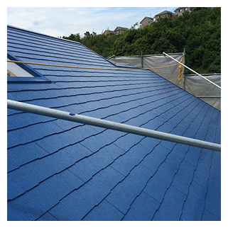 屋根は遮熱塗料で夏の省エネ効果が楽しみです。ブルーの屋根とアクセントが素敵です。