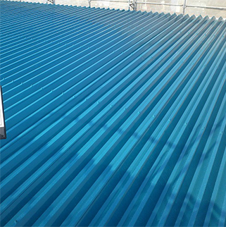 すがすがしいザ・ブルーに仕上がりました。ボルトには専用キャップをして雨水の浸入もカット。外壁もピカピカになりました。屋号も塗り直し、ビシッと決まりました。